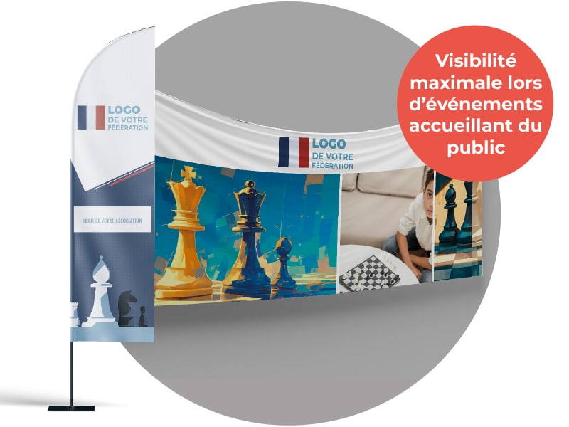 Affichez votre club en grand ! Banderoles, drapeaux, roll-ups, tous les supports sont personnalisables à vos couleurs et habillent votre stand.